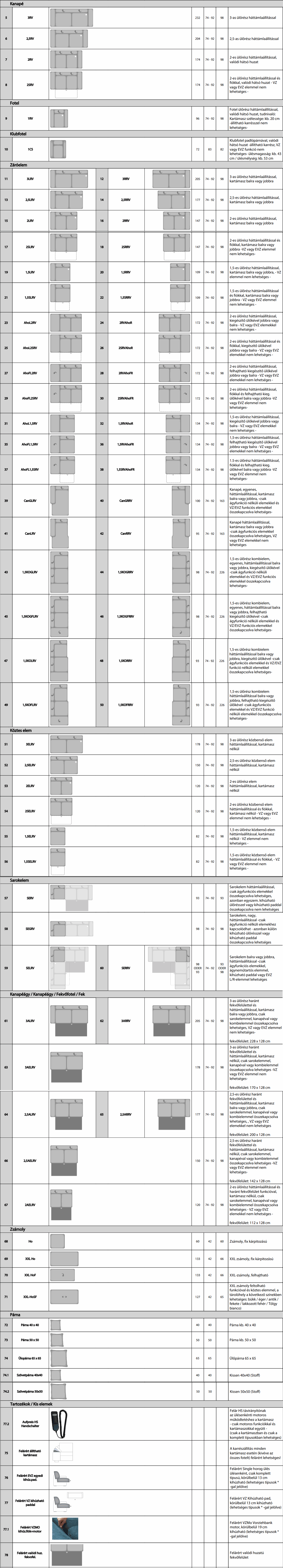 Méretek (3. 4. 5. oszlopban): szélesség x magasság x mélység (cm)