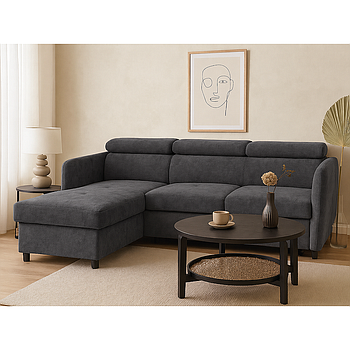 Ravenna sarokgarnitúra, állítható fejtámlákkal, vendégággyal, felnyíló tárolós elemmel, Szürke, 286x200 cm