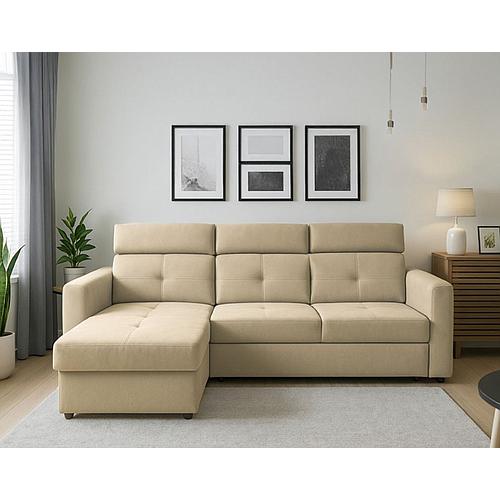 Ez a nyitható, vendégágy funkcióval ellátott sarokkanapé tökéletesen alkalmazkodik a mindennapi igényekhez, miközben kényelmes pihenőhelyet és extra alvófelületet biztosít. A beépített, felnyitható ágyneműtartó praktikus tárolási lehetőséget kínál takarók, párnák vagy ágyneműk elhelyezésére.