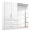 A szekrény belső elrendezése a mindennapi használatot teszi kényelmessé. A kétajtós rész mögött két polc kínál bőséges helyet a hajtogatott ruháknak. A tükrös ajtó mögött egy polc és egy ruharúd biztosítja a kényelmes akasztós tárolást. Az alsó részben két lapos fiók extra belső tagolással ideális a kisebb kiegészítőknek. Legalul két mély fiók gondoskodik a nagyobb holmik, pulóverek vagy ágyneműk rendezett tárolásáról.