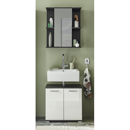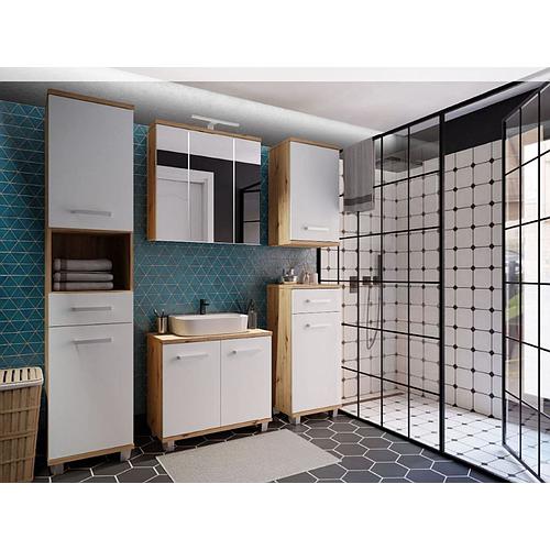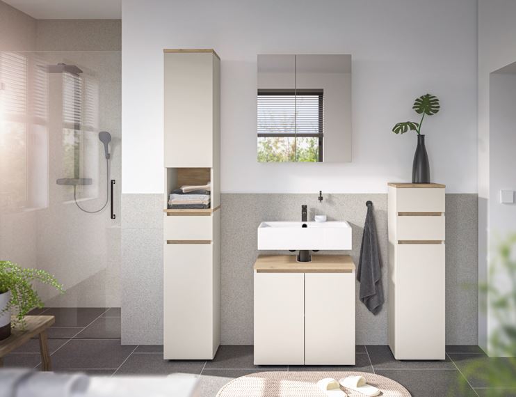 A bútorszett több, egymással tökéletesen kombinálható bútorból áll: magas szekrény, tükrös szekrény, komód és alsószekrény, így könnyedén kialakítható egy egységes, modern enteriőr akár fürdőszobában, akár más helyiségekben.