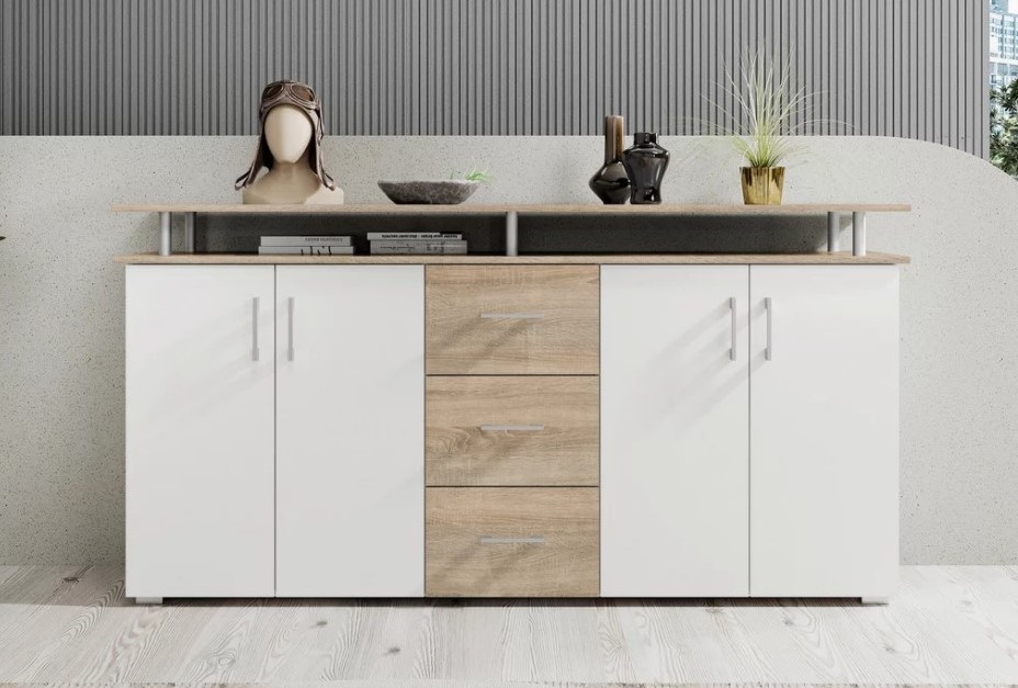 XXL méretű komódunk ideális tárolási megoldást kínál a nappaliba, hálószobába vagy akár az irodába is. A nyitott polcos egység, emellett a 4 ajtós elem és 3 fiókos felépítés biztosítja a tárolóteret mindennapi használatra.