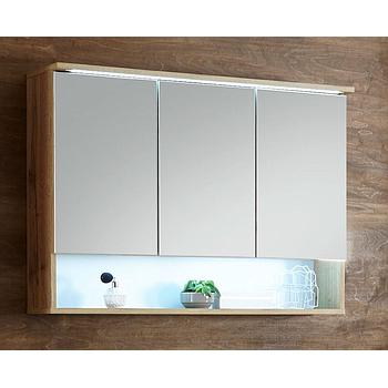 A tükrös ajtó mögött 5 fapolc, a nyitott elemben 5 üvegpolc található.